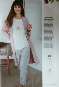 Après avoir hésité sur pas mal de modèles, j’ai finalement choisi un pantalon en dentelle extensible et élastiqué à la taille, de la revue Fait mains n° 423, d’avril 2017. Le patron est très simple. J’ai juste rallongé le bas, viré les poches et j’ai fait un premier test, en 38. Le modèle est un peu large mais c’est tout à fait acceptable pour un jogging. On est en mode cocooning… Pour la version pyjama, je le reprendrai un peu sur les hanches pour faire une version moins large.