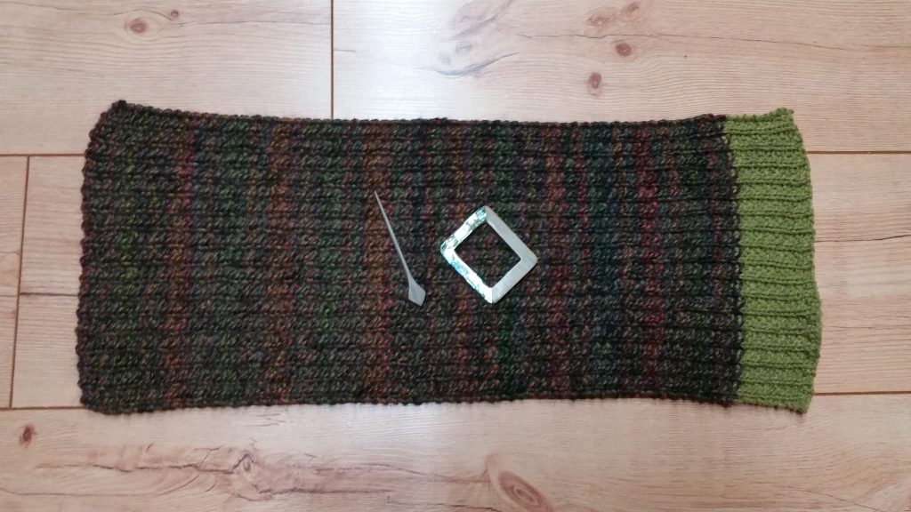 J’ai aussi tricoté le col dans l’autre sens (la largeur)… J’ai commencé par monter 69 mailles, ce qui s’est avéré beaucoup trop large pour ce col. Donc j’ai tout défait et recommencé avec 54 mailles. A l’issue de mes deux pelotes le col était encore trop large et pas assez long, au lieu de tout défaire encore j’ai acheté une pelote unie verte (Lang Yak, coloris 772.0013) pour rajouter un petit bout qui s’harmoniserait avec le fermoir nacré. Mon col mesure 22 cm de large et 56 cm de long (dont 6 cm en vert). Pour qu’il soit portable, il faut quand même le replier, bon ça fait un genre…