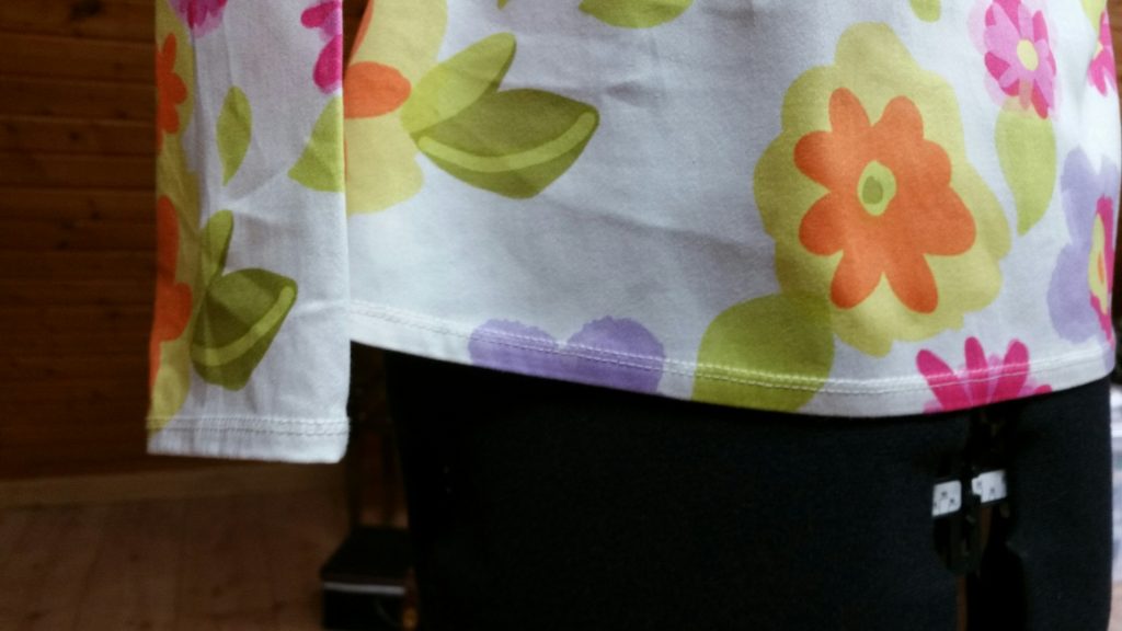 Ce patron est très certainement à refaire, y compris dans la version robe. Il est un peu chiche en finitions proposées, la version avec large col ne m’emballait pas et la version sans col se contente d’un simple ourlet au niveau de l’encolure. C’est ce que j’ai fait finalement, le tissu n’étant pas assez élastique pour faire un bord façon biais. Par contre il se prêtait nettement mieux à la couture avec aiguille double donc tous les ourlets ont été faits de cette façon.