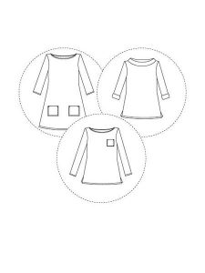 Ce patron est très certainement à refaire, y compris dans la version robe. Il est un peu chiche en finitions proposées, la version avec large col ne m’emballait pas et la version sans col se contente d’un simple ourlet au niveau de l’encolure. C’est ce que j’ai fait finalement, le tissu n’étant pas assez élastique pour faire un bord façon biais. Par contre il se prêtait nettement mieux à la couture avec aiguille double donc tous les ourlets ont été faits de cette façon.