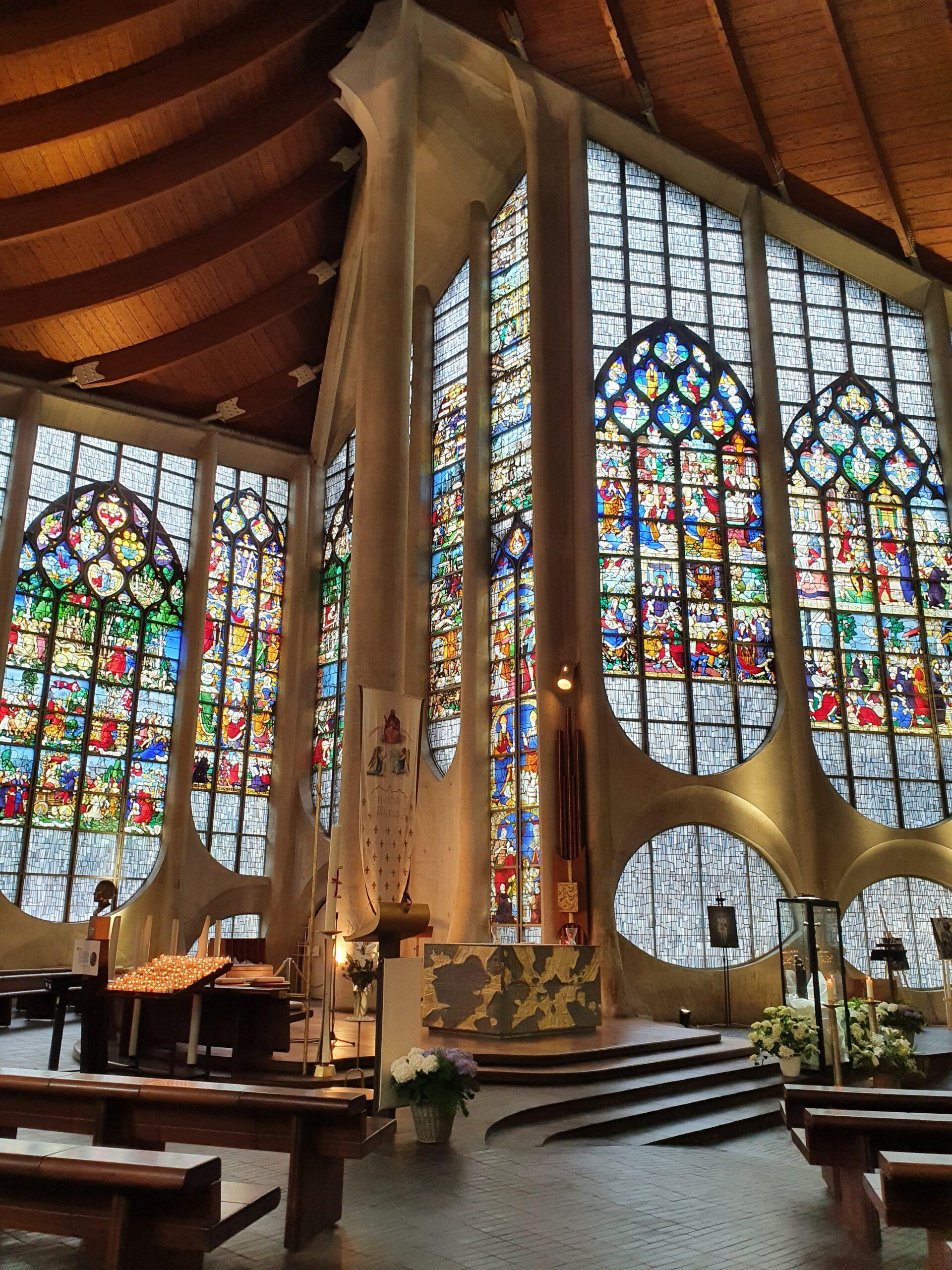 J’aime beaucoup ta tunique bien plus belle qu’en blanc qui parait terne à côté! et elle s’accorde parfaitement avec ton pantalon. Tes photos sont magnifiques, j’adore l’église Sainte Jeanne d’Arc, elle est unique et les vitraux sont une splendeur.