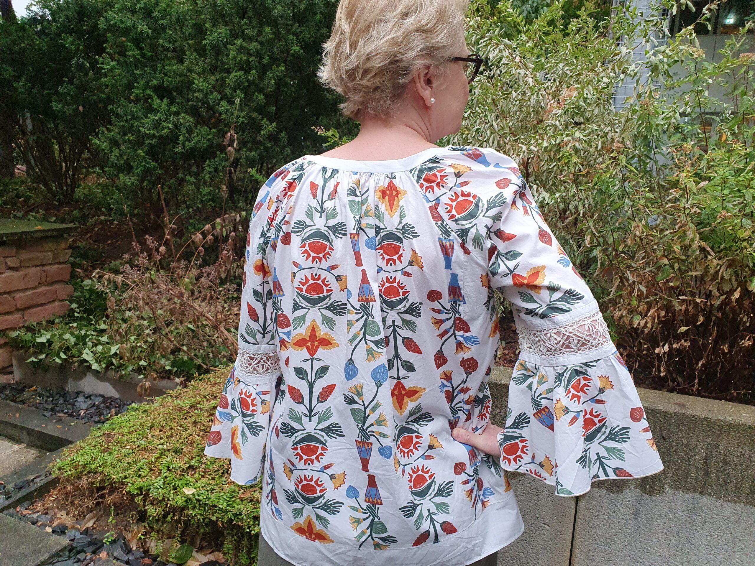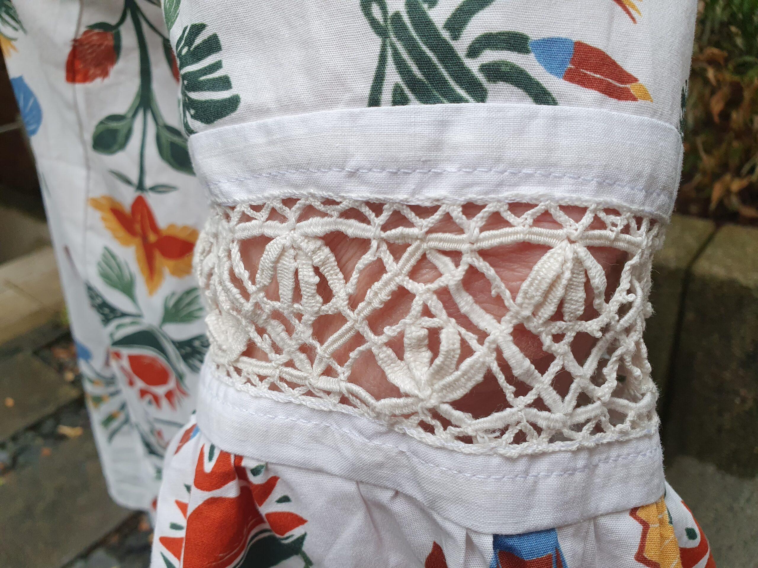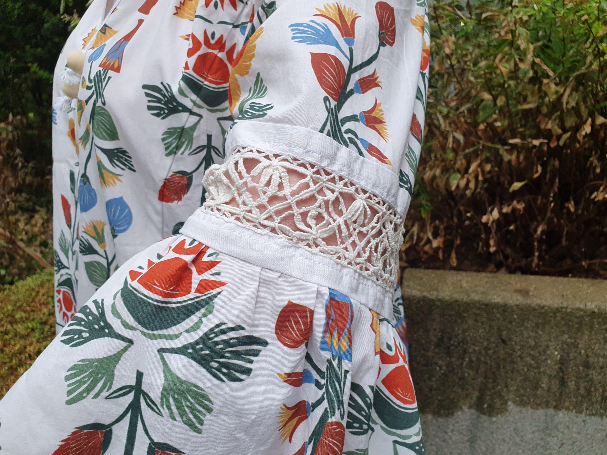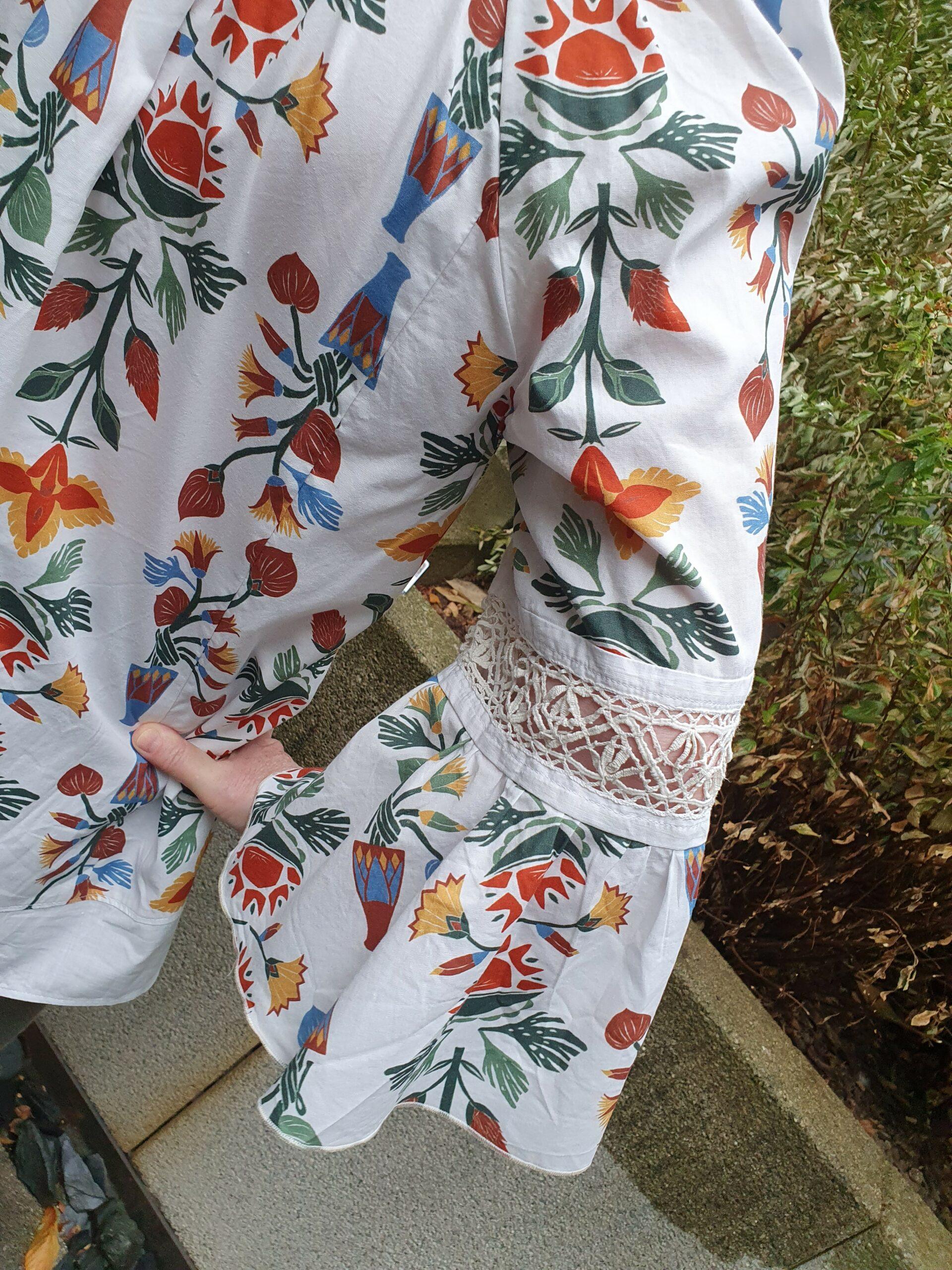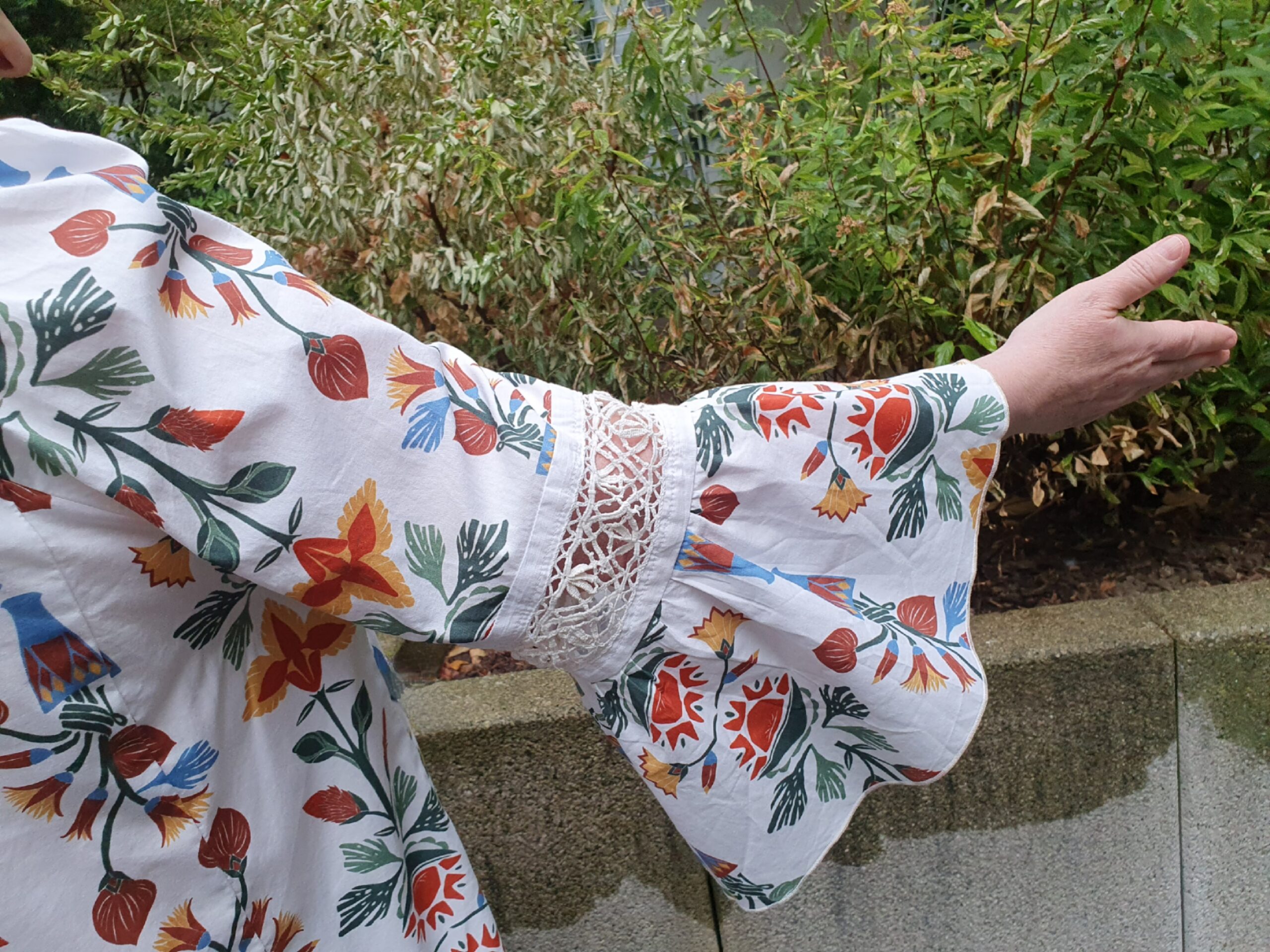 Ta tunique est superbe et très gaie. Tu as super bien fait les découpes, car il faut avoir l’oeil averti pour remarquer les raccords. La bande de guipure aux manches est parfaite et lui donne une touche classe.
