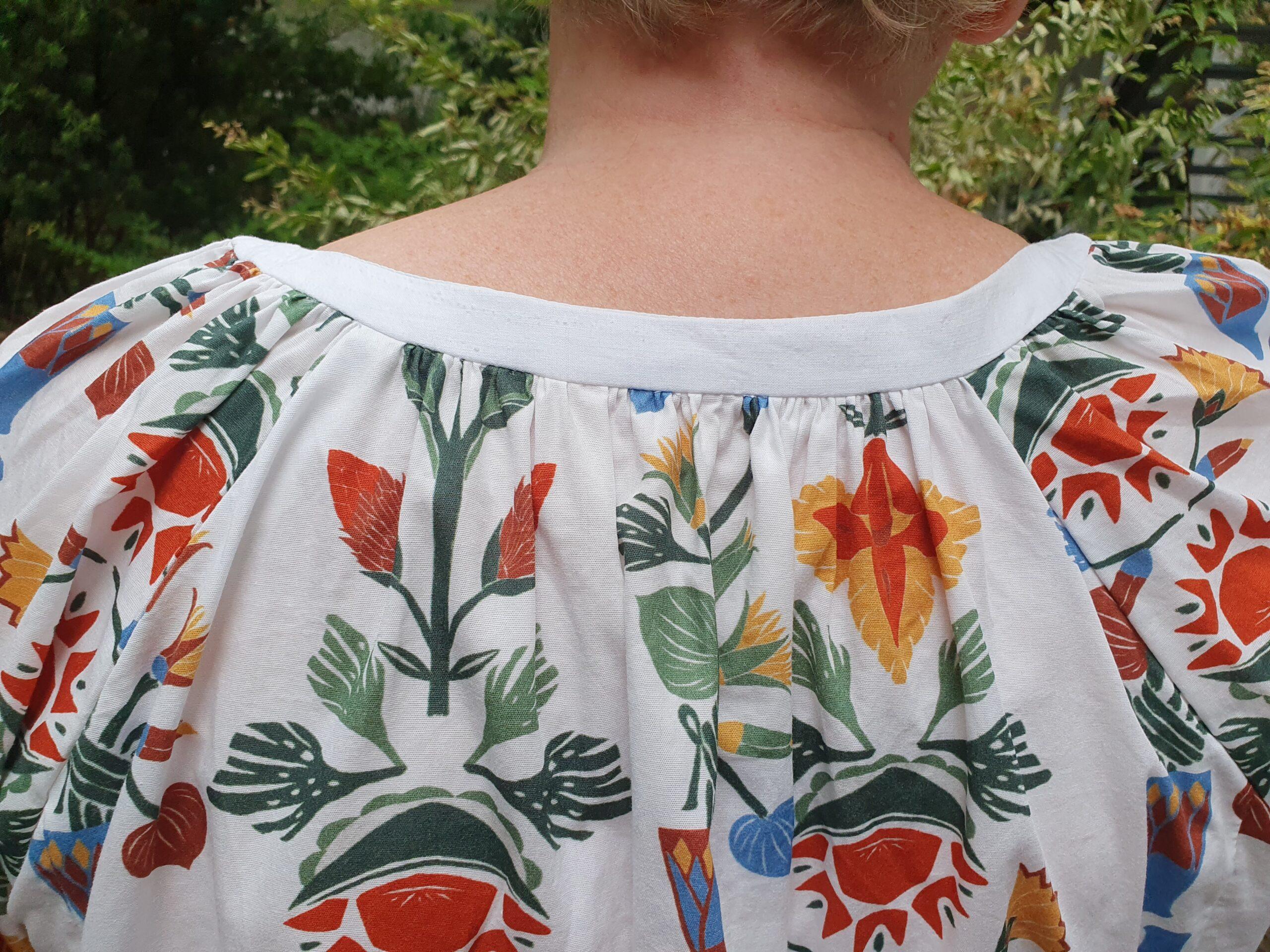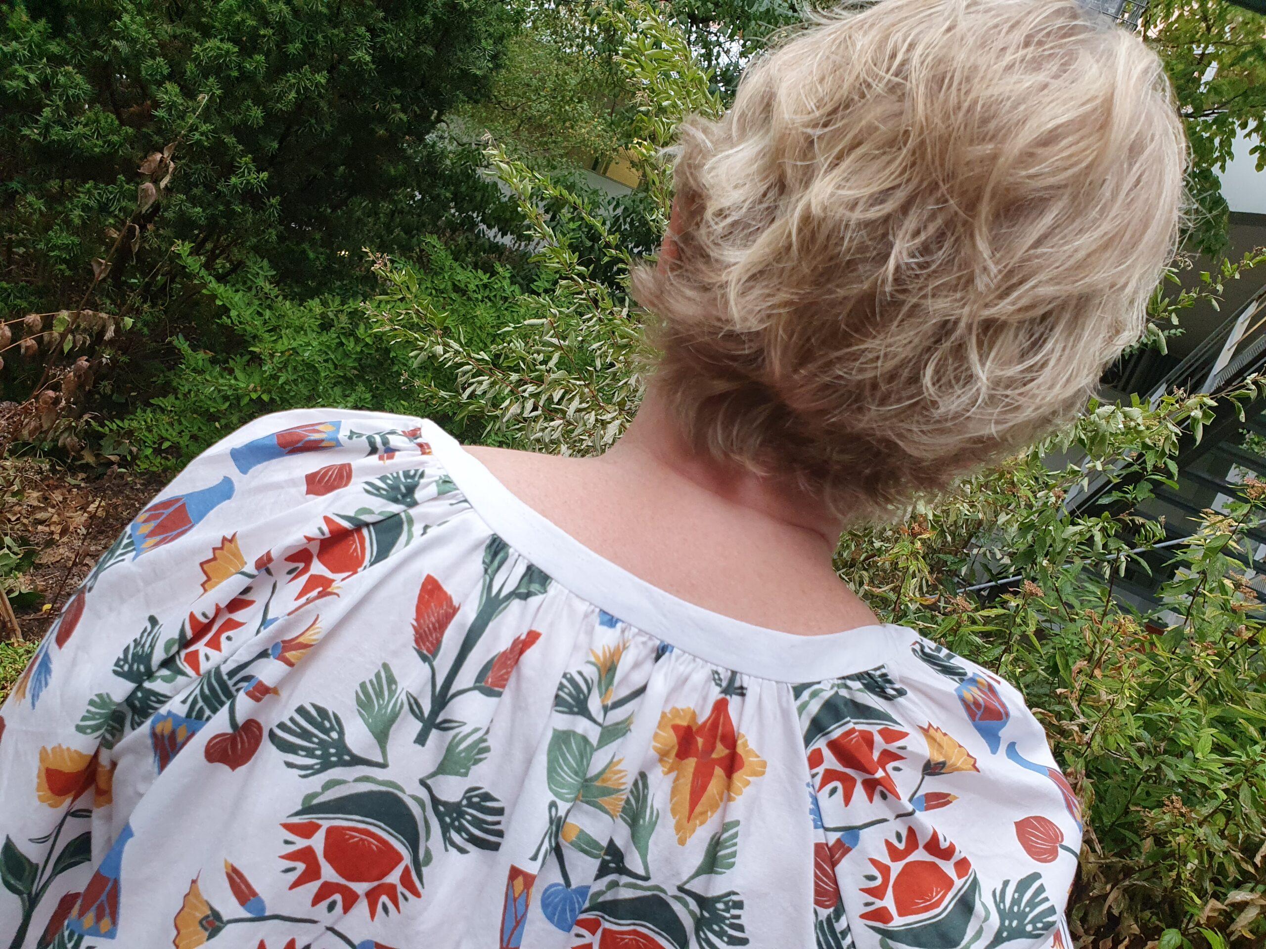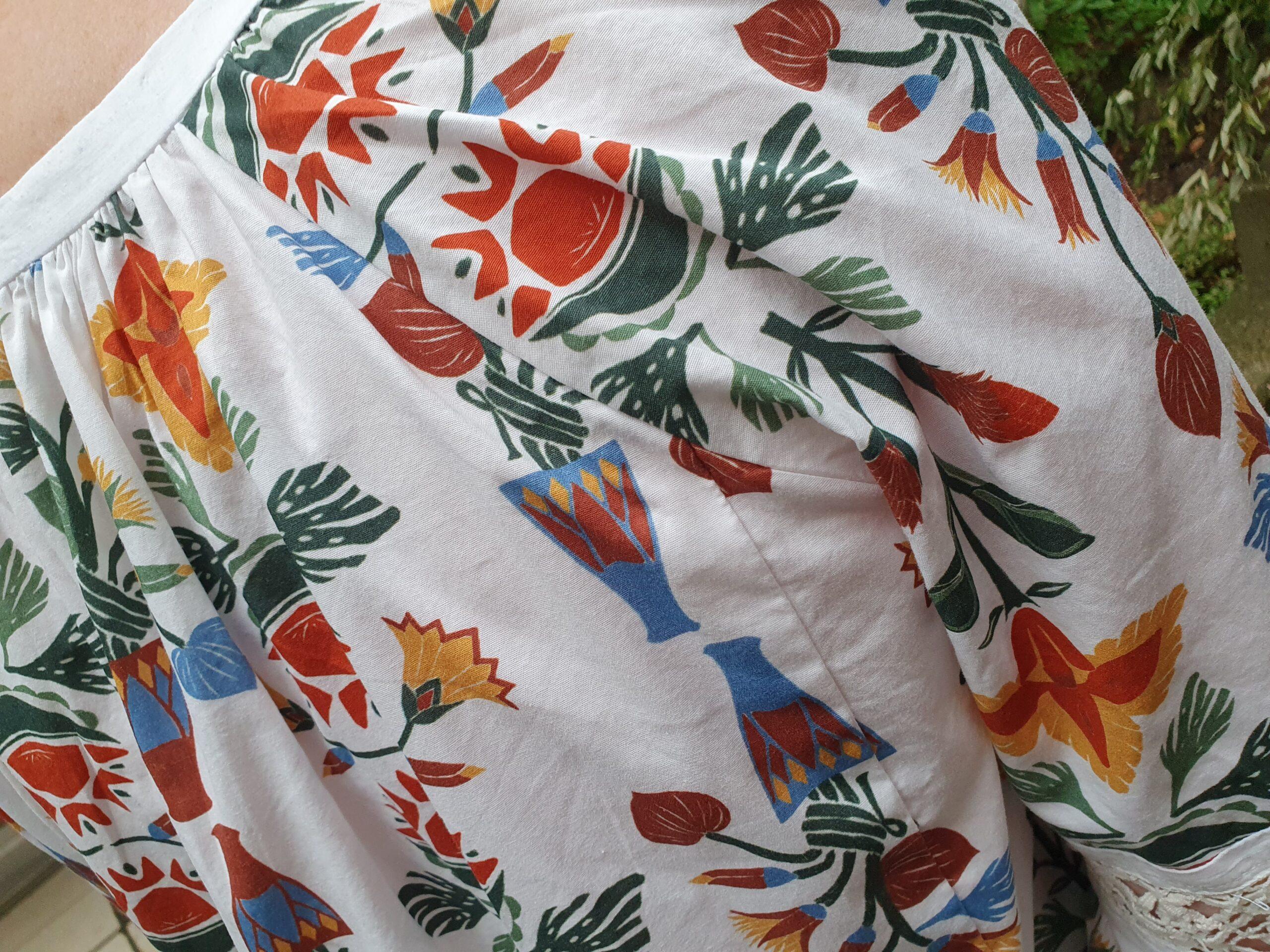 La deuxième difficulté à surmonter fut la réalisation de raccords les plus propres possible. En effet, vous aurez pu constater sur le dessin technique de la tunique que le devant et le dos comportent des découpes princesse. Or, avec mes grands motifs ethniques, il était essentiel de respecter les raccords. C’est là que j’ai été particulièrement contente d’avoir acheté plein de petits coupons du même tissu. Clairement, ce projet n’entre pas dans la catégorie du zéro déchet, car il a fallu tailler les pièces dans plusieurs coupons pour retomber sur le même dessin.